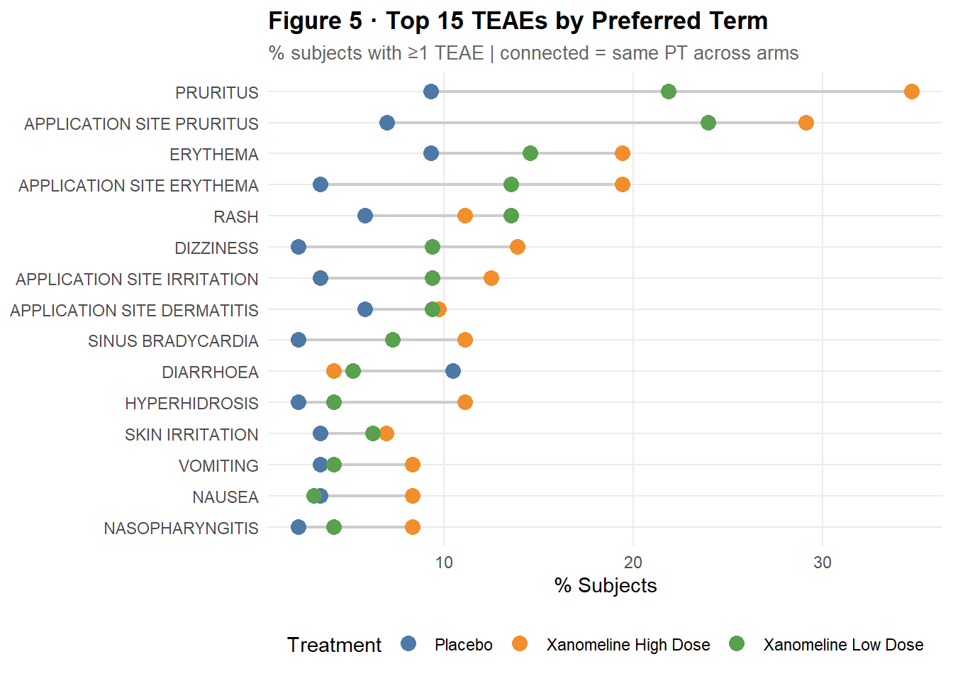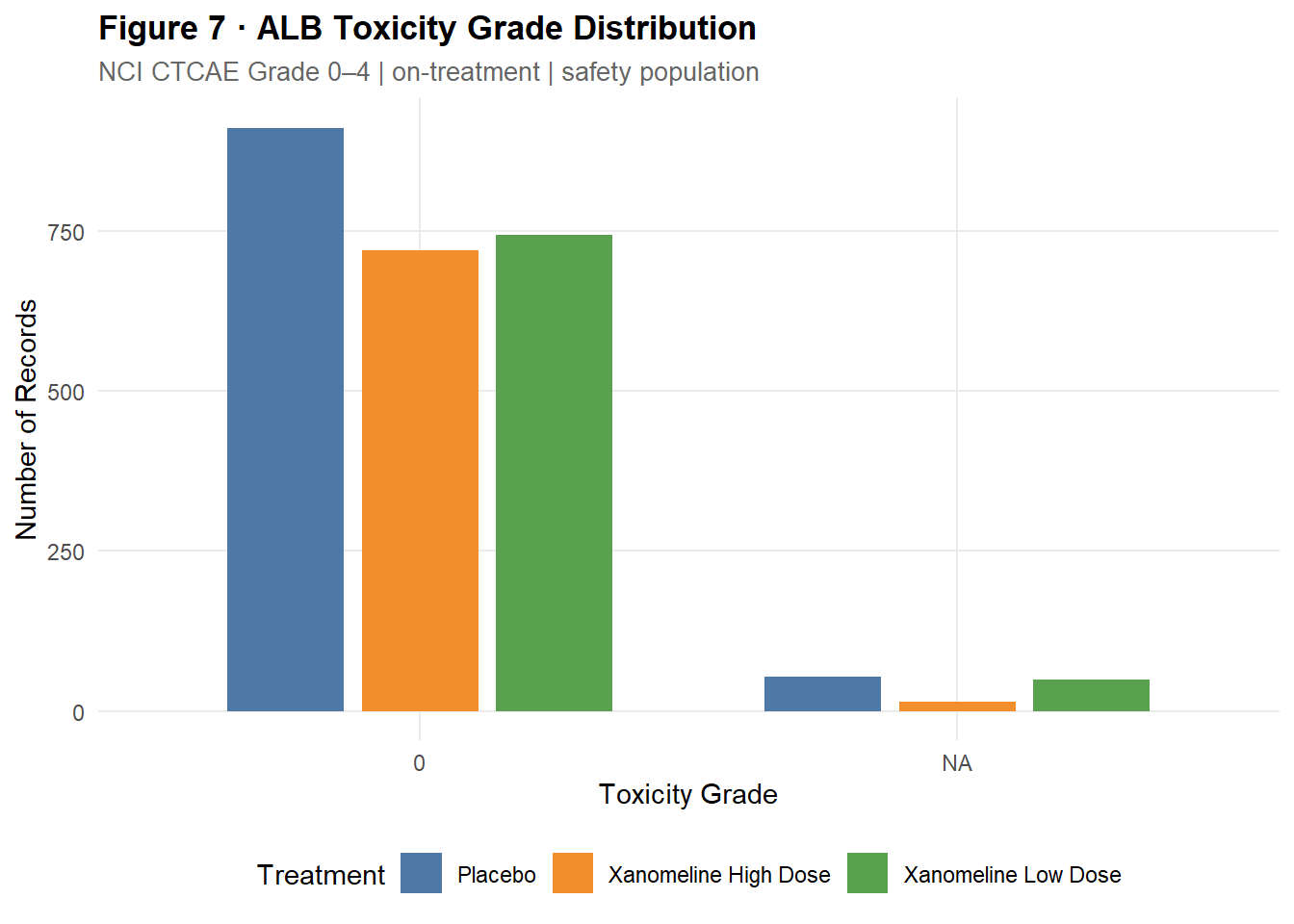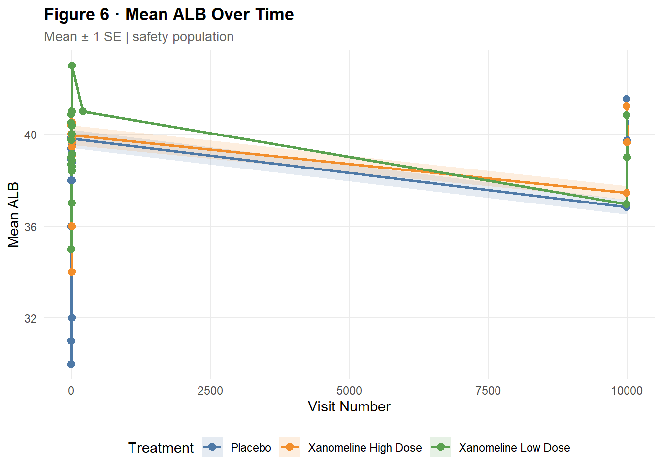 # ── Safety-population N per arm (denominator for AE %) ──────────────────────trt_n <- adsl |> dplyr::filter(SAFFL =="Y") |> dplyr::count(TRT01A, name ="N_TRT")# ── First available lab PARAMCD ──────────────────────────────────────────────lab_param <-unique(adlb$PARAMCD)[1]cat("\nLab parameter for Figures 6 & 7:", lab_param, "\n")