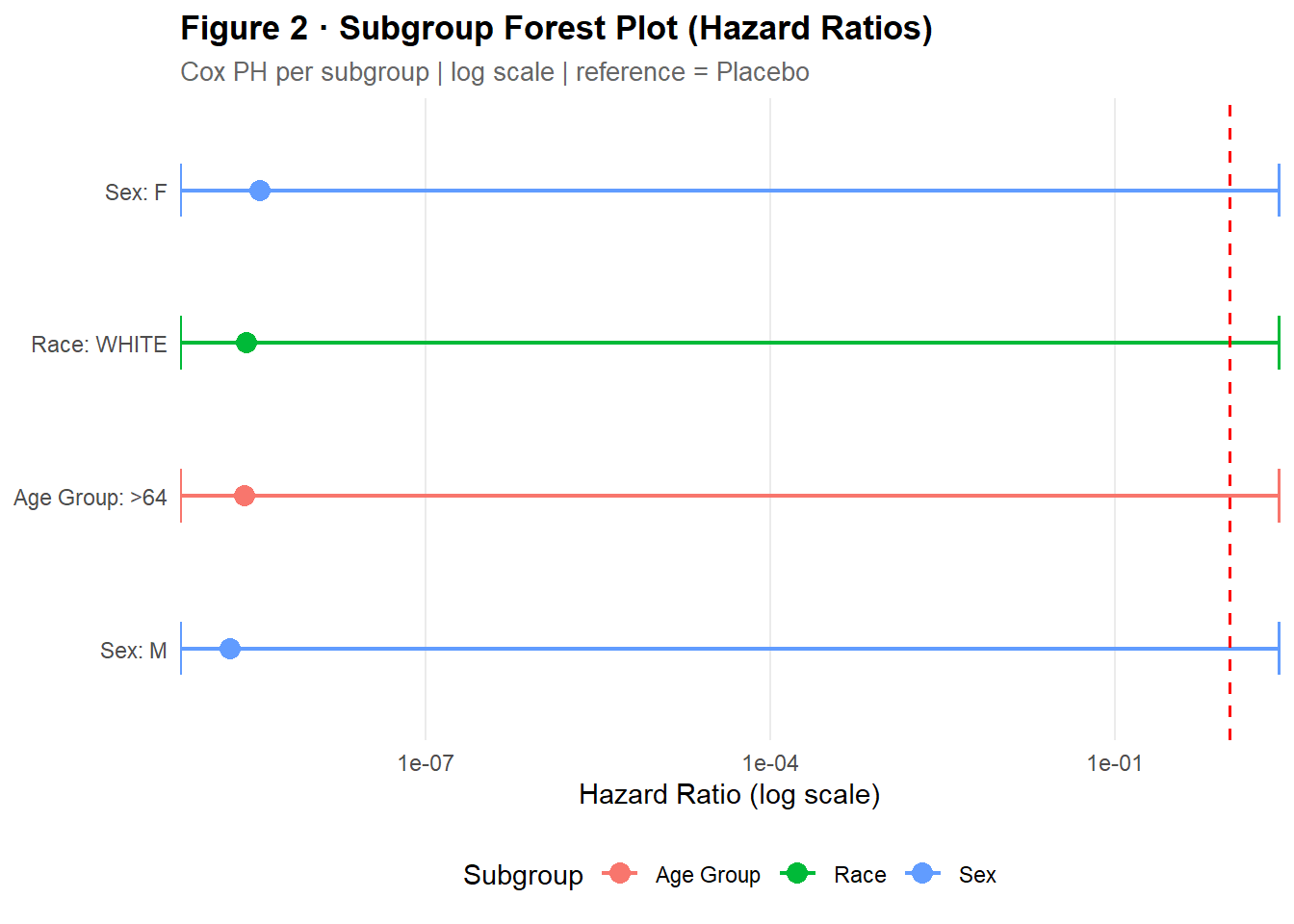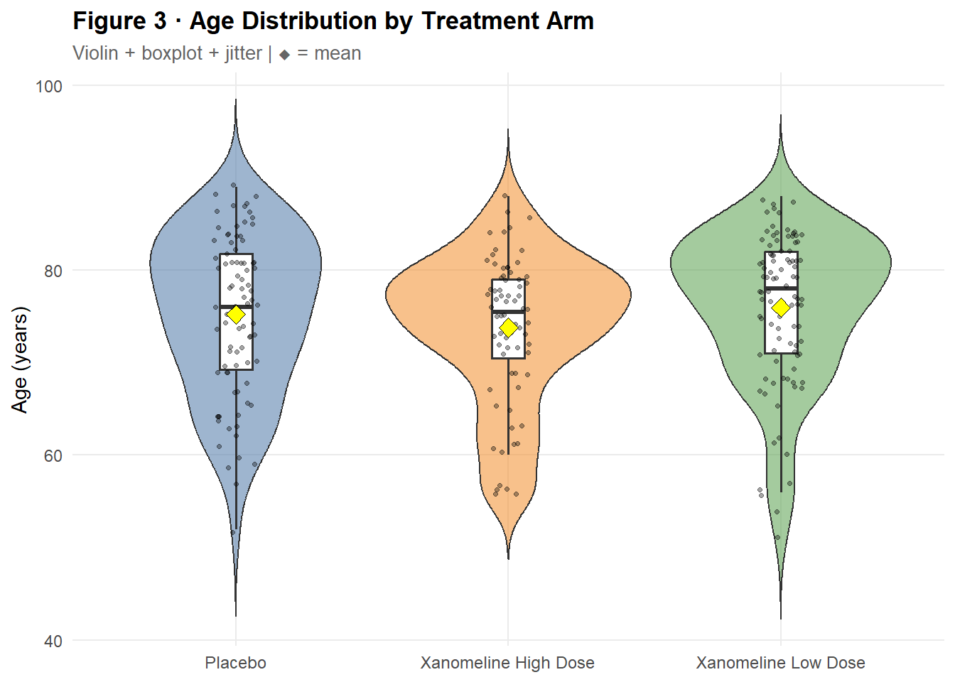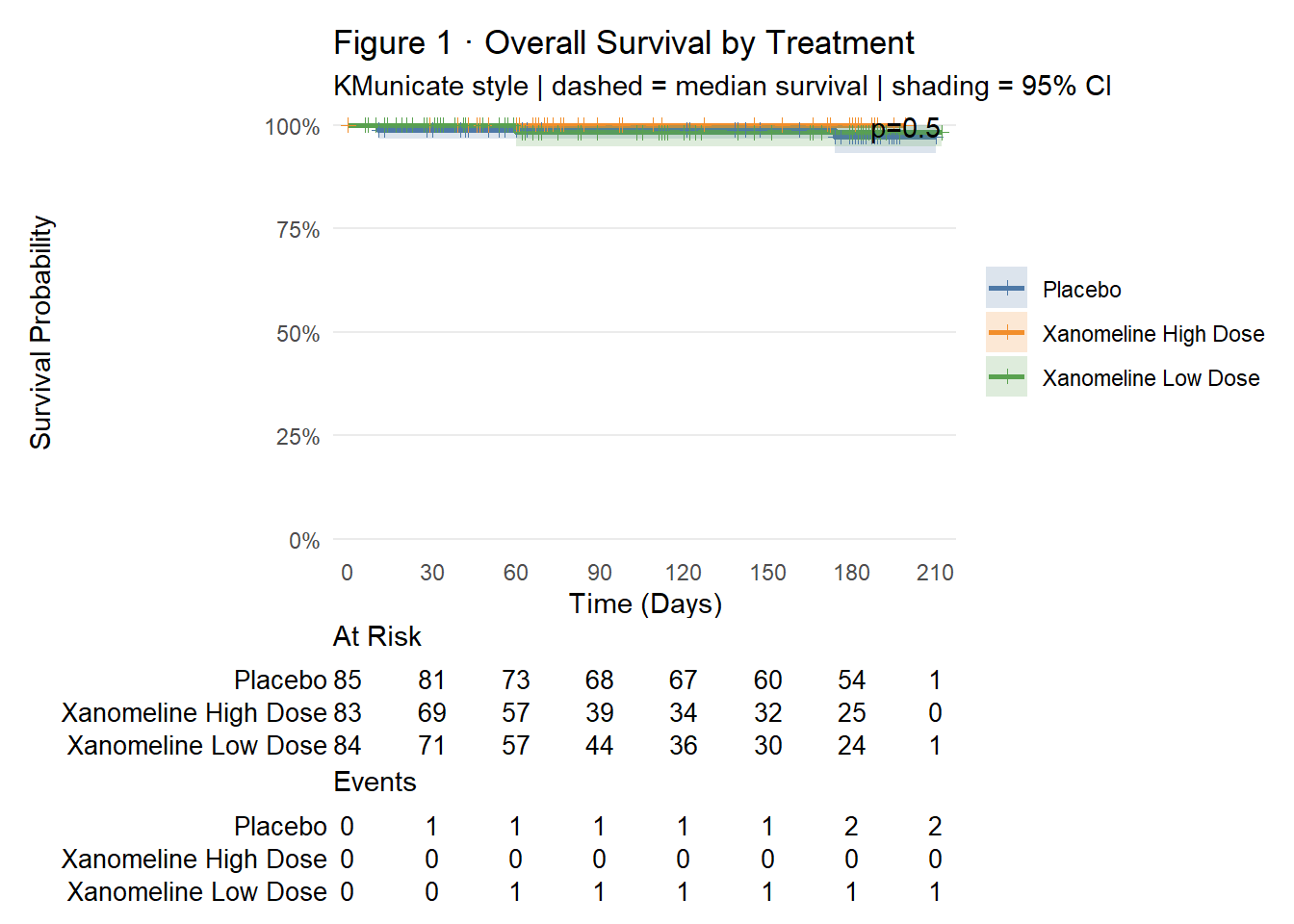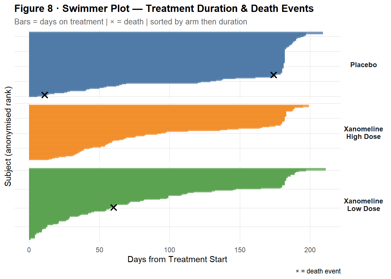 # ── Safety-population N per arm (denominator for AE %) ──────────────────────trt_n <- adsl |> dplyr::filter(SAFFL =="Y") |> dplyr::count(TRT01A, name ="N_TRT")# ── First available lab PARAMCD ──────────────────────────────────────────────lab_param <-unique(adlb$PARAMCD)[1]cat("\nLab parameter for Figures 6 & 7:", lab_param, "\n")